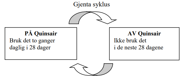 Du bruker Quinsair hver dag i 28 dager, deretter tar du en 28-dagers pause der du ikke inhalerer Quinsair. Du kan deretter starte en ny behandlingsrunde.
