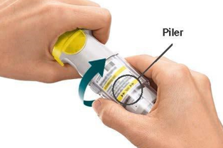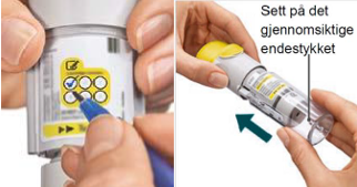 Hvis det gjennomsiktige endestykket allerede er vridd, følg trinnene «ÅPNE» og «TRYKK» under «Daglig bruk» for å ta medisinen.