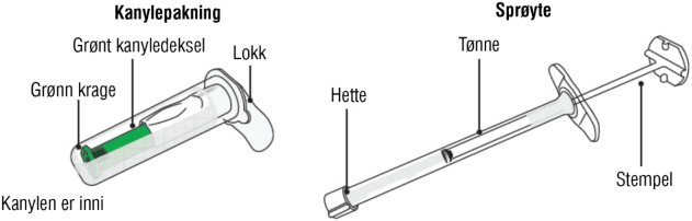 Eske med 0,5 ml sprøyte er pakket sammen med én kanyle (1,2 mm × 20 mm).