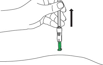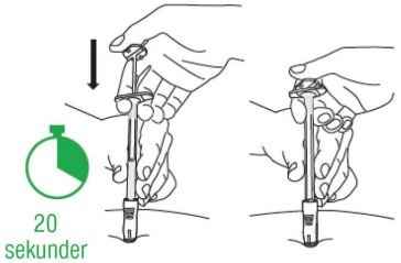 Merk: Under injeksjon skal trykket på kanylen opprettholdes for å unngå at kanylen dekkes og låses av sikkerhetsmekanismen.