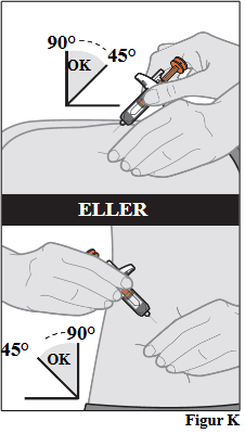 b. Med en rask “pilkastlignende” bevegelse, setter du nålen helt inn i hudfolden med en vinkel på 45 til 90 grader (se figur K).