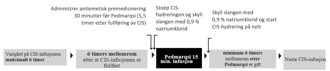 Det er planlagt en påfølgende cisplatin-infusjon innen 6 timer.