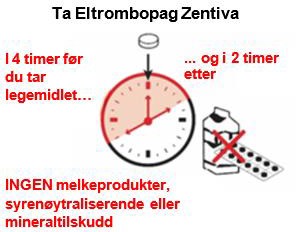 Bruk ikke Eltrombopag Zentiva sammen med mat eller drikke som inneholder melk siden kalsium i melkeproduktene påvirker absorpsjonen av legemidlet. For ytterligere informasjon, se ‘Når du skal ta det’ i avsnitt 3.