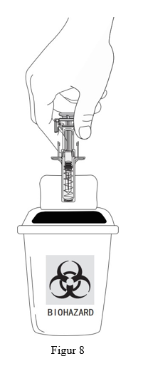 Brukte sprøyter skal kastes i en beholder for skarpe gjenstander (se figur 8). For din og andres sikkerhet må du aldri bruke sprøyter på nytt. Kast beholderen for skarpe gjenstander i henhold til lokale retningslinjer.