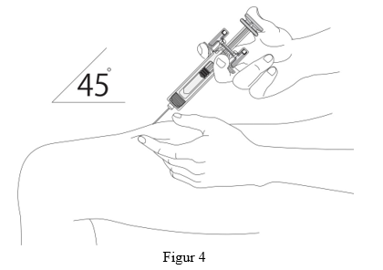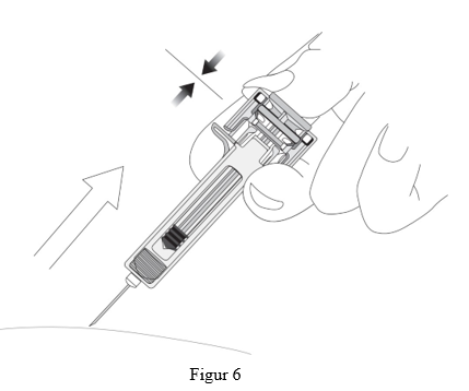 Når stempelet er trykket så langt det går, fortsett å trykke på stempelhodet mens du drar ut kanylen og slipp huden (se figur 6).