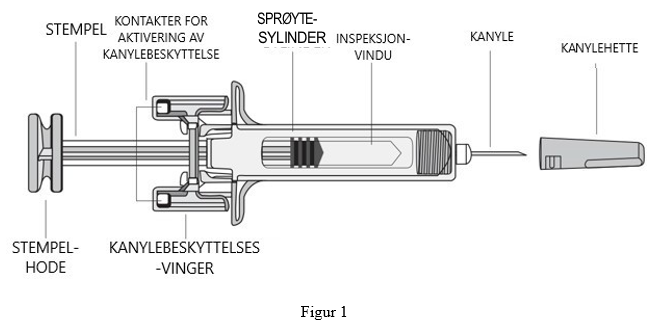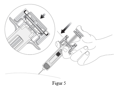 Injiser hele mengden av legemidlet ved å trykke ned stempelet til stempelhodet er helt nede mellom kanylens beskyttelsesvinger (se figur 5).