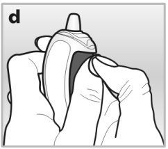 Utløserknappen må trykkes ordentlig inn for å frigjøre dosen gjennom neseapplikatoren - se bilde c.