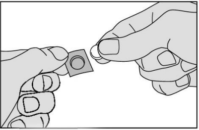 3. Ikke press legemidlet gjennom folien. Det kan skades fordi det lett går i oppløsning. Brett det merkede hjørnet av folien og trekk den av.