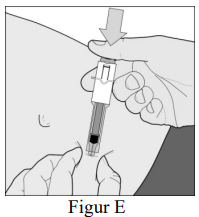 8. Injiser HELE innholdet i sprøyten ved å presse stemplet ned så langt det går (figur E).
