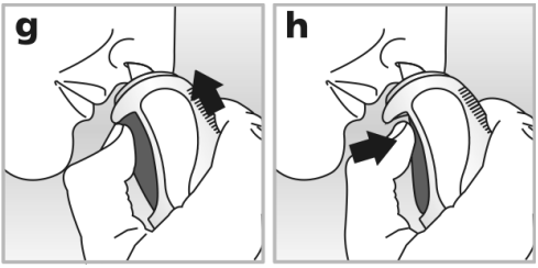 4. Plasser neseapplikatoren i et av neseborene - se bilde g. Rett enden av neseapplikatoren mot utsiden av nesen, vekk fra neseryggen. Dette hjelper deg til å få legemidlet til riktig del av nesen.