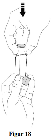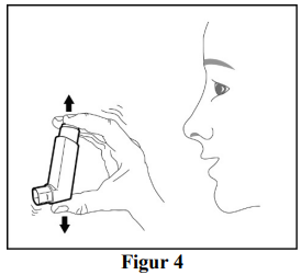 Hold inhalatoren loddrett, bort fra ansiktet og rist den godt (se figur 4).