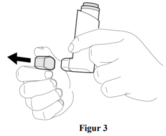 Fjern hetten fra munnstykket (se figur 3). Undersøk på innsiden av munnstykket før du bruker inhalatoren for å se at den er tom.