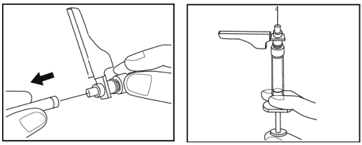 Mens den holdes loddrett, trekk langsomt i stempelet for å overføre all oppløsning inn i sprøyten. Skal ikke ristes.
