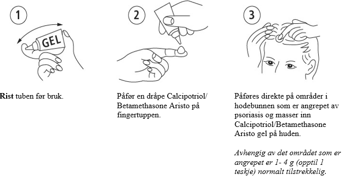 Bruk en kam for å fjerne løse hudflak før du bruker Calcipotriol/Betamethasone Aristo i hodebunnen. Bøy hodet bakover for å unngå at Calcipotriol/Betamethasone Aristo renner ned i ansiktet. Det kan hjelpe å lage skill i håret før du bruker Calcipotriol/Betamethasone Aristo. Påfør Calcipotriol/Betamethasone Aristo på det angrepne området med fingrene og masser inn forsiktig.