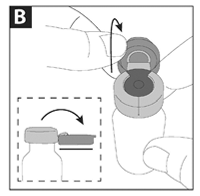 5. Åpne ampullen med oppløsningsvæske ved å vri av tuppen. Klem hele innholdet over i hetteglasset (figur 2). Deretter virvler du hetteglasset varsomt helt til pulveret er fullstendig oppløst og væsken er klar.