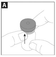 Trinn A: Med det blå lokket vendt mot deg plasserer du hetteglasset på et flatt underlag. Hold hetteglasset stødig med den ene hånden, og vipp det blå lokket sakte opp med den andre hånden.