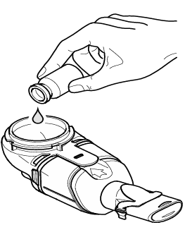 4. Hell all den tilberedte Cayston fra hetteglasset over i Altera forstøvermunnstykkets legemiddelbeholder (figur 3a). Sørg for å fullstendig tømme hetteglasset. Bank forsiktig hetteglasset mot siden av legemiddelbeholderen om nødvendig.
