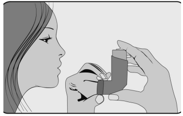 5. Rett etter at du starter å puste inn gjennom munnen, presser du ned på toppen av inhalatoren med pekefingeren for å utløse en dose av legemidlet, mens du fortsatt puster sakte og dypt inn. Pass på at dosen med legemiddel ikke slipper ut på over-, undersiden av munnen eller i munnvikene.