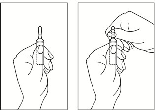 2) Bruk begge hender til å åpne ampullen, mens du holder den nedre delen av ampullen i den ene hånden, bruker du den andre hånden til å brekke av den øvre delen av ampullen i retningen bort fra det fargede punktet (se bildene nedenfor).