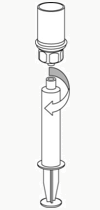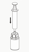 7. Trekk luft inn i en tom, steril sprøyte. Mens hetteglasset med pulver står loddrett kobler du sprøyten til Mix2Vial-settets luer-lock. Press luft inn i hetteglasset med pulver.