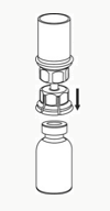 5. Med en hånd rundt hetteglasset med pulver og den andre hånden rundt hetteglasset som inneholdt oppløsningsvæske, skrus Mix2Via-settet forsiktig fra hverandre i to deler. Kast hetteglasset som inneholdt oppløsningsvæske, med den blå Mix2Vial adapterdelen festet på.
