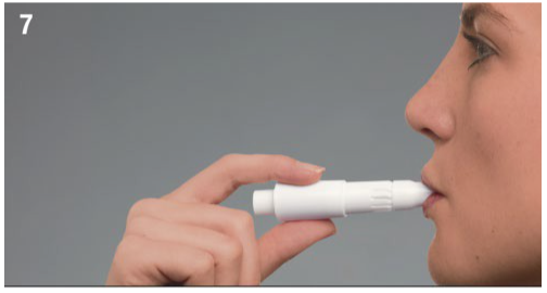9. Ta Turbospin inhalator ut av munnen og hold pusten i omtrent 10 sekunder, eller så lenge det er komfortabelt, deretter puster du sakte ut.