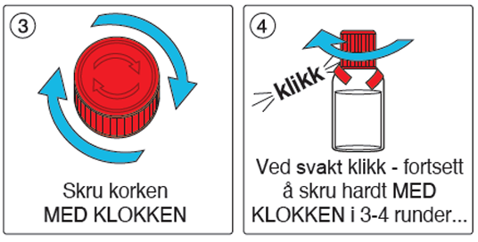 For at pulveret skal falle ned i væsken, begynn med å skru korken MED KLOKKEN.