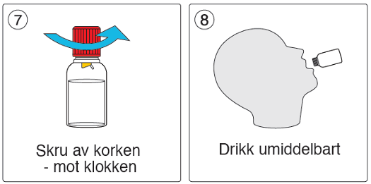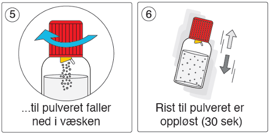 Når pulveret er oppløst, åpne flasken ved å skru korken mot klokken. Drikk umiddelbart.