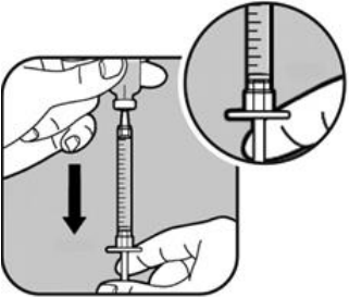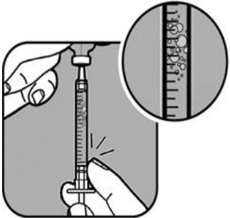 Trekk ut sprøytestemplet til enden av stemplet er på linje med markeringen som tilsvarer din dose. Sprøyten fylles da med luft. |