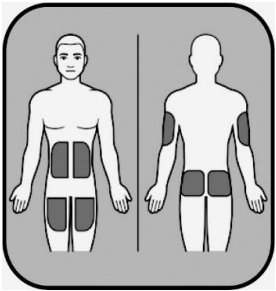 Injeksjonen skal settes i fettlaget rett under huden. Du skal velge et injeksjonssted. Dersom du skal sette injeksjonen på deg selv, er egnede områder: