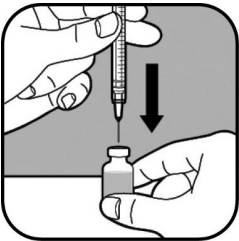 Trekk stemplet langsomt ut for å fylle sprøyten, til enden av stemplet er på linje med markeringen som tilsvarer din dose. Hold nålespissen i væsken hele tiden. |