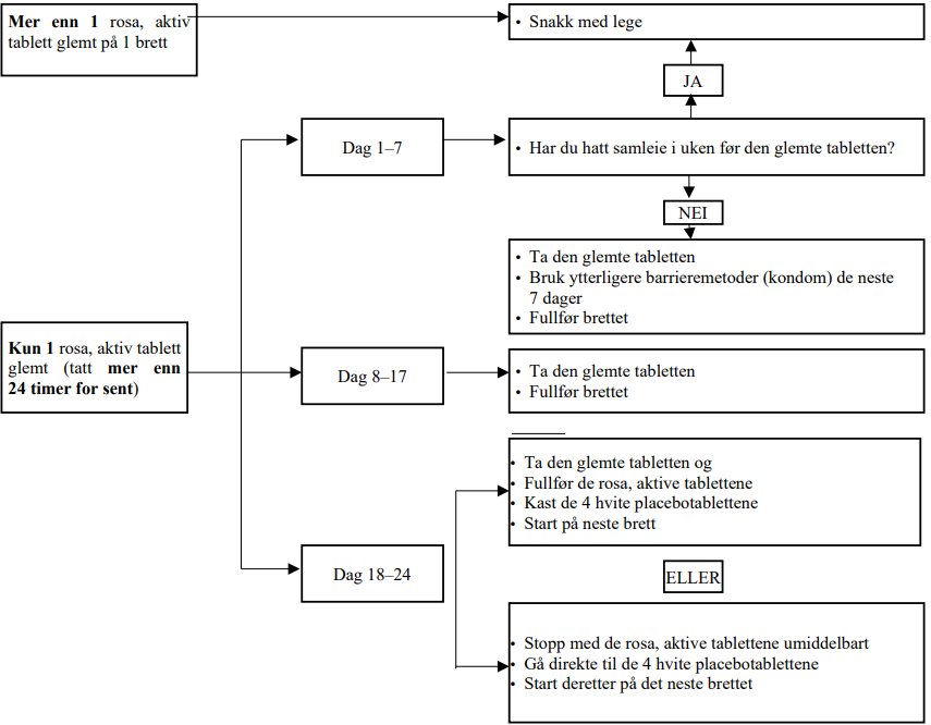 Hvis du kaster opp innen 3-4 timer etter at du har tatt en rosa, aktiv tablett, eller hvis du har alvorlig diaré, er det en risiko for at virkestoffene i pillen ikke blir fullstendig tatt opp i kroppen din.