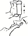 2. Sett tommelen på flaskens øvre flik og pekefingeren i bunnen av flasken. Sett langfingeren på flaskens nedre flik. Hold flasken opp ned.