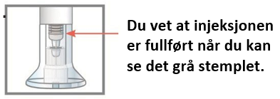 A. Etter at du trykker på den turkise injeksjonsknappen vil du høre 2 høye klikk. Det andre klikket sier fra om at injeksjonen er fullført. Du vil også se det grå stempelet i den klare bunnen.