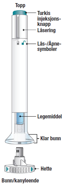 Pennen inneholder glassdeler. Håndter den forsiktig. Ikke bruk den dersom du mister den på en hard overflate. Bruk en ny penn for injeksjonen din.