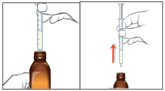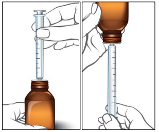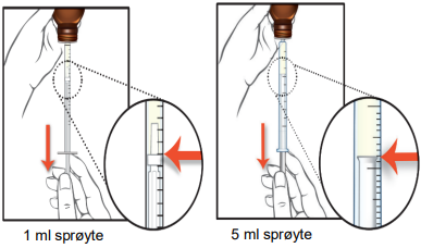5. Trekk sprøytesylinderen langsomt tilbake, slik at det nødvendige volumet (antall ml) mikstur trekkes inn i sprøyten. Plasser stempelenden på linje med foreskrevet volummarkering, som vist på tegningen.