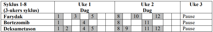 Basert på din leges anbefaling, er Farydak-dosen enten 20 mg eller 15 mg eller 10 mg, og tas én gang daglig på dag 1, 3, 5, 8, 10 og 12 i løpet av en syklus på 21 dager.