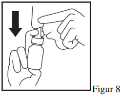 4. Pust langsomt inn gjennom det åpne neseboret, samtidig som du bestemt trykker kragen på dysen ned med fingrene for å sprute en fin spray inn i neseboret (Figur 8).