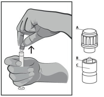 Fjern plasthetten (A) med en bevegelse rett oppover. For å opprettholde sterilitet skal ikke tuppen av sprøyten (B) berøres (se figur 2).