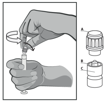 Hold sprøyten loddrett i den rillede delen (C). Ta tak i hetten (A) med den andre hånden og vri den stive plasthetten forsiktig mot klokken (se figur 1):