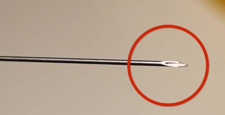 Sørg for at skråtaket på nålen er i oppover rettet posisjon (ikke opp ned):