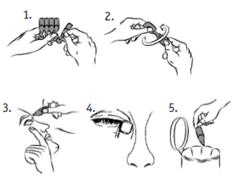 Dra forsiktig ned det nedre øyelokket slik at det dannes en lomme. Vri endosebeholderen oppned og klem på den slik at det kommer ut 1 dråpe i de(t) berørte øyet/øynene.