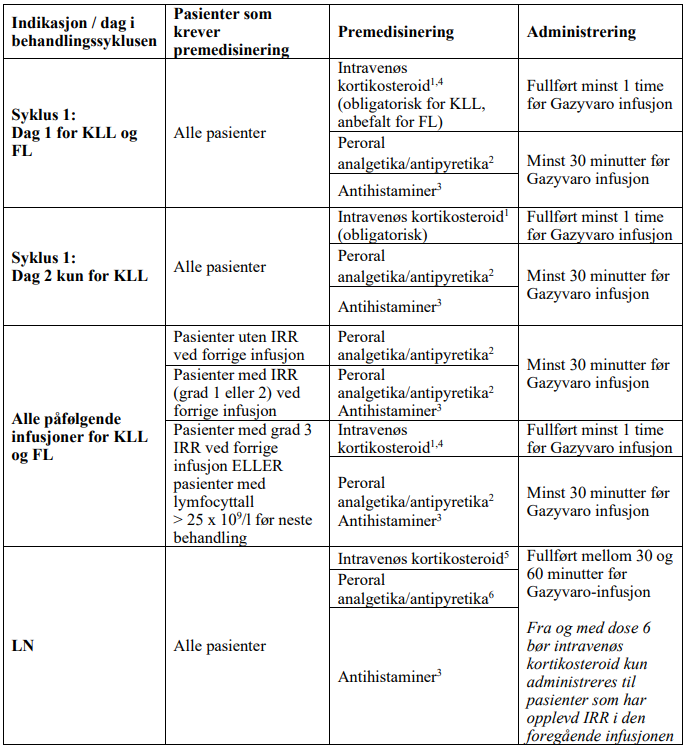 Før hver infusjon med Gazyvaro, vil du bli gitt legemidler som bidrar til å redusere mulige infusjonsrelaterte reaksjoner eller “tumorlysesyndrom”. Tumorlysesyndrom er en potensiell livstruende komplikasjon forårsaket av kjemiske endringer i blodet på grunn av nedbryting av døende kreftceller (se avsnitt 3).
