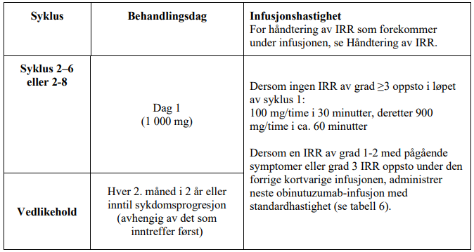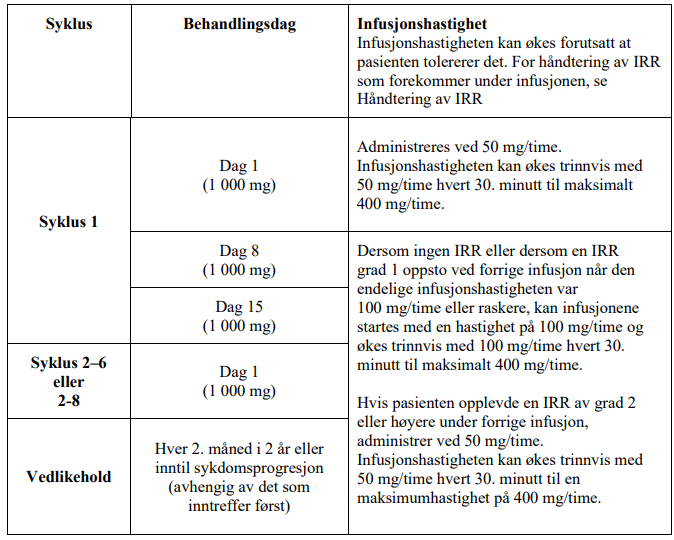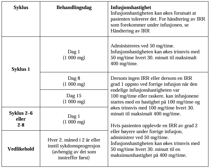 Kronisk lymfatisk leukemi (KLL)Tabell 5: Kronisk lymfatisk leukemi: Standard infusjonshastighet ved fravær av IRR/hypersensitivitet og anbefalinger i tilfelle en IRR forekom ved forrige infusjon