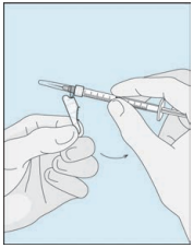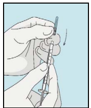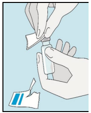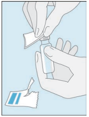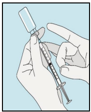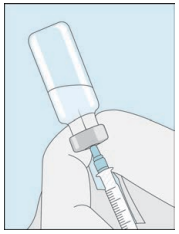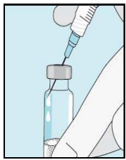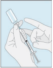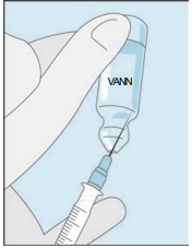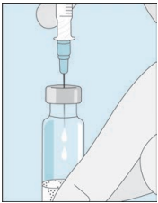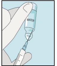 Åpne hetteglasset med det sterile vannet til injeksjonsvæsker. Stikk kanylen inn i hetteglasset og snu hetteglasset med vann forsiktig opp ned. Pass på at spissen på kanylen alltid befinner seg under vannoverflaten for å hindre at luftbobler kommer inn i sprøyten.