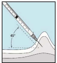 Stikk gjennom huden i 45 graders vinkel. Kanylen bør stikkes nesten helt inn.