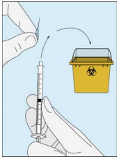 Ta kanylen av sprøyten og kast (kasser) den i beholderen for skarpe gjenstander slik at ingen kan skades.
