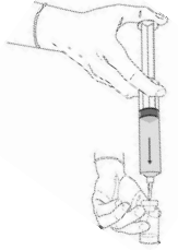 2. Fjern beskyttelseshetten fra sprøyten og ta vare på denne til senere bruk. Sett en kanyle som passer for rekonstituering på sprøyten. Hold sprøyten rett opp og press stempelet forsiktig oppover for å fjerne luft.
