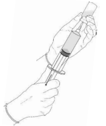 4. Uten å trekke kanylen opp fra hetteglasset holdes hetteglasset med pulver og sprøyten i et fast grep mens det ristes forsiktig for å sikre at pulveret blir fullstendig oppløst.