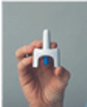 4. Hold nesesprayen i fingergrepet som figuren viser. Husk at det bare er en dose, så ikke trykk på utløsermekanismen før nesestykket er i nesen.